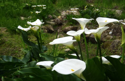 カラーは里芋科の花で江戸時代にオランダから日本に伝わった南アフリカ原産の花です。花期は長く当寺では5月中旬から6月末まで一か月半の間に次々と花を咲かせます。緑に囲まれた湿地で咲く純白で清楚なカラーの群生は疲れた心を癒します。