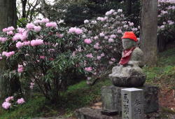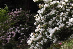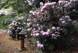 シャクナゲは、筑紫シャクナゲなど原種シャクナゲが主体で優良選抜品種を中心に植栽しています。花期は四月中旬から下旬で森に囲まれた境内はシャクナゲの花で賑わいます。しだれ桜の開花と時期が重なりますので、しだれ桜と一緒に鑑賞する事もできます。
