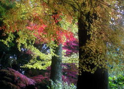 幹回り2.3М、推定樹齢300~400年の大モミジなど巨樹が多い。紅葉は全てのモミジが同時に紅葉せず、紅葉の早い個体が11月に入って色づきはじめ遅くても11月中旬頃には完全に紅葉します。次に遅い個体が色づきはじめ11月下旬に完全に紅葉し落葉は12月に入ってになります。