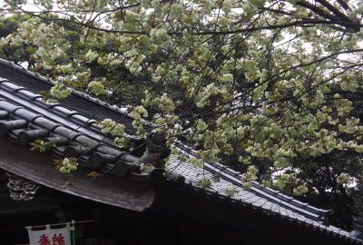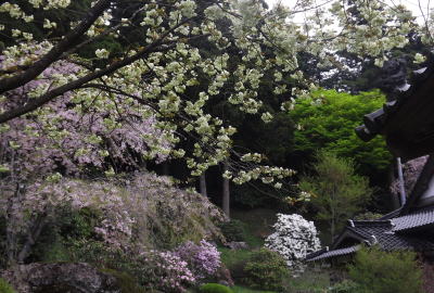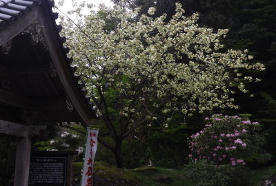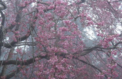 一重のしだれ桜の様子です。境内は霧に包まれています。