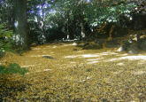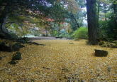 雪舟庭のイチョウの落葉が始まりました。雪舟庭は色づきません木の上層部は色が付き始めています。