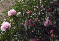一重のしだれ桜が2分咲になりました。満開は来週になります。しゃくなげが開花を始めました。